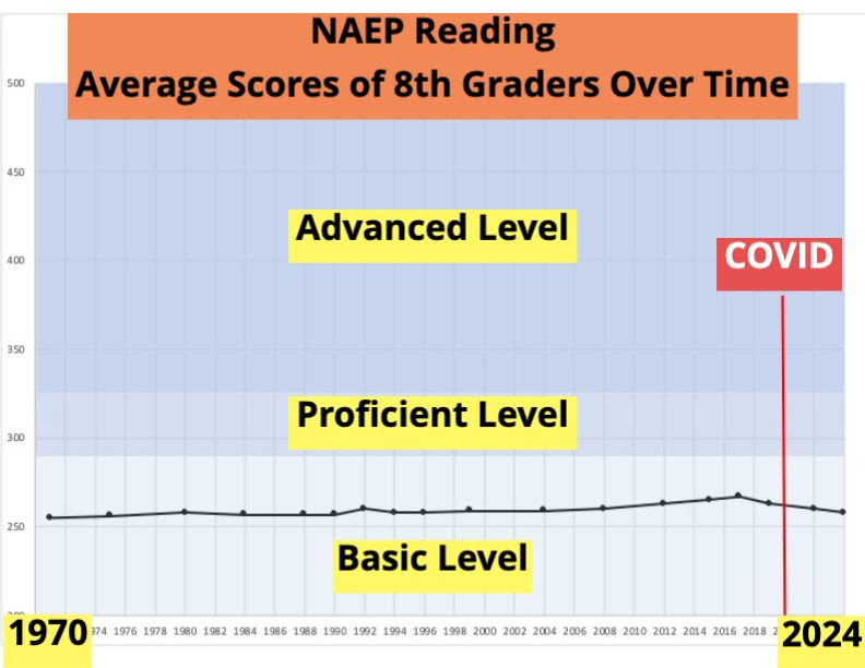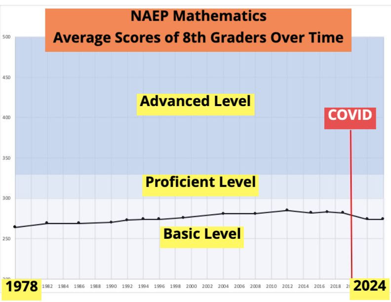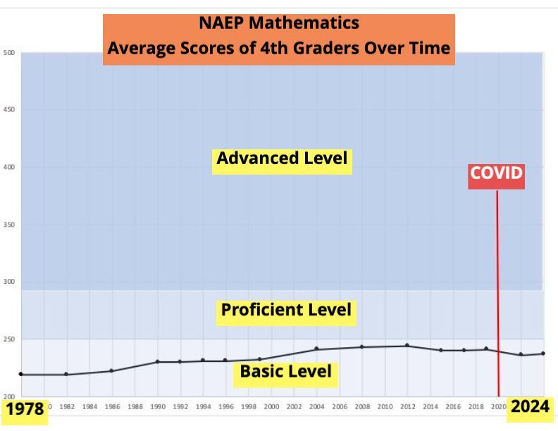 The figures above reflect the average NAEP scores for 4th and 8th graders in math and reading since the test was first administered in the 1970s. You will notice that there has never been a time when the average score was in the proficient range, much less the advanced range. Although COVID did result in lower average scores, scores were already on a declining trend before school closures due to COVID.